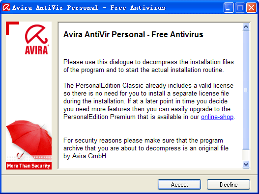 AntiVir(德国 小红伞)的免费个人版本提供以免受到电脑病毒的侵害,有效的保护个人电脑以及工作站的使用。 它可以检测并移除超过 50,000种病毒,支持网络更新。