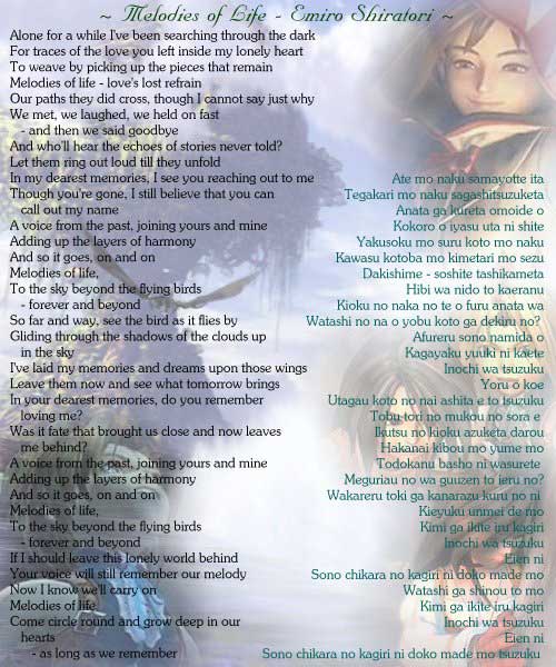 游戏中, 嘉莉特(Garnet)一遍又一遍地吟唱这道曲子(尽管她并不知道的歌词)。当希丹(Zidane)发现嘉莉特一个人在独唱这道美丽的曲子时,他禁不住问嘉莉特关于这首曲子的事情。嘉莉特说,她也记不起从哪学会的,只是这道曲子能够使她的内心平静。本人认为当希丹听道这道曲子的一刻,他就爱上了嘉莉特。正如“Eyes onMe”是属于斯考尔(Squall )和莉诺雅(Rinoa)的歌曲,“Melodies ofLife”则是属于希丹(Zidane)和嘉莉特(Garnet)的。